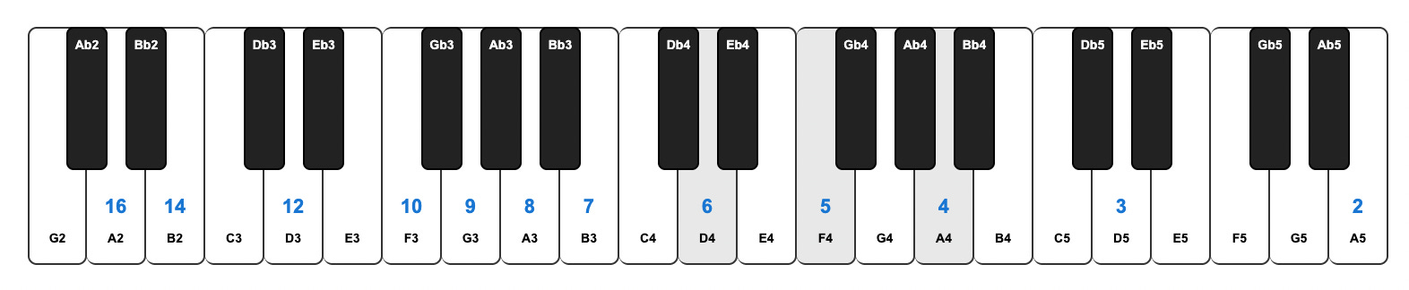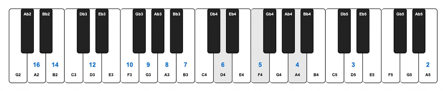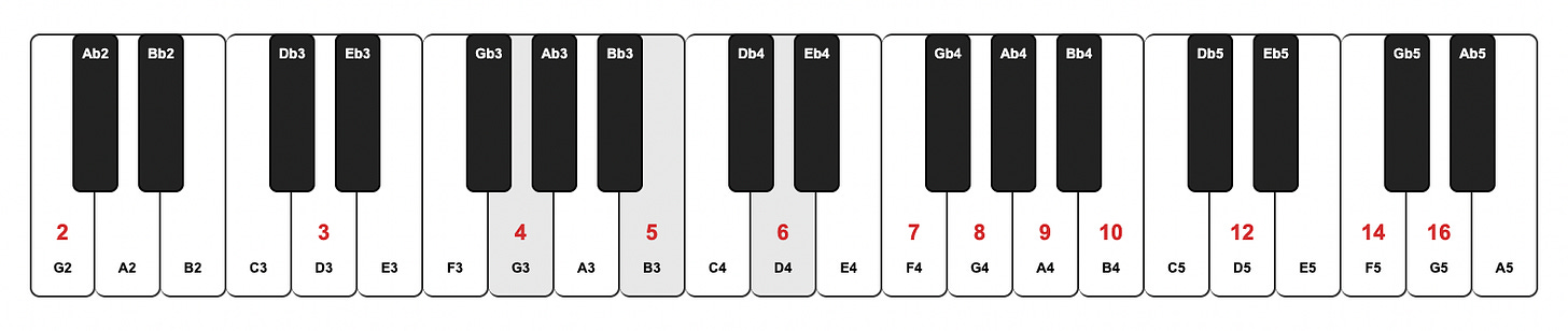 The combination of all these notes is literally the major chord, as in all chords called major are subsets of it. The most common canonical major chord is the one on 4, 5, and 6, labelled gray in this picture. Adding in 7 or 9 gets spicy, especially if you keep in 8 or 10 or move them to 7/2 or 9/2. Music with that spiciness added is generally referred to as ‘jazz’. 11 and 13 aren’t things at all which is why I didn’t include them. You might notice that the tonic here is placed on the G instead of C. That’s to make the 7 land on a white note. A strong case can be made that in jazz the default major mode should be Wednesday instead of Tuesday.