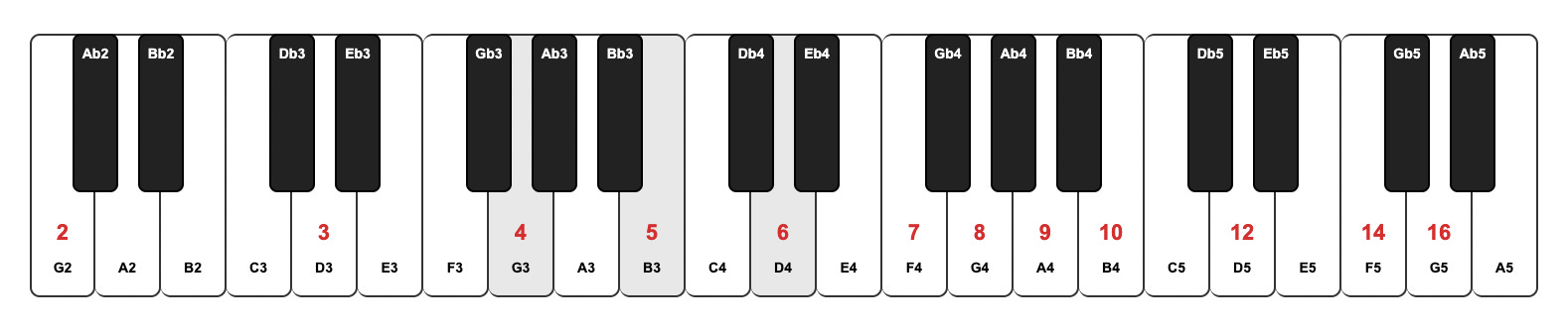 The notes of the major chord all come from the overtones of one note, like this, with the overtone keys labeled with red numbers for their ratio from G1: